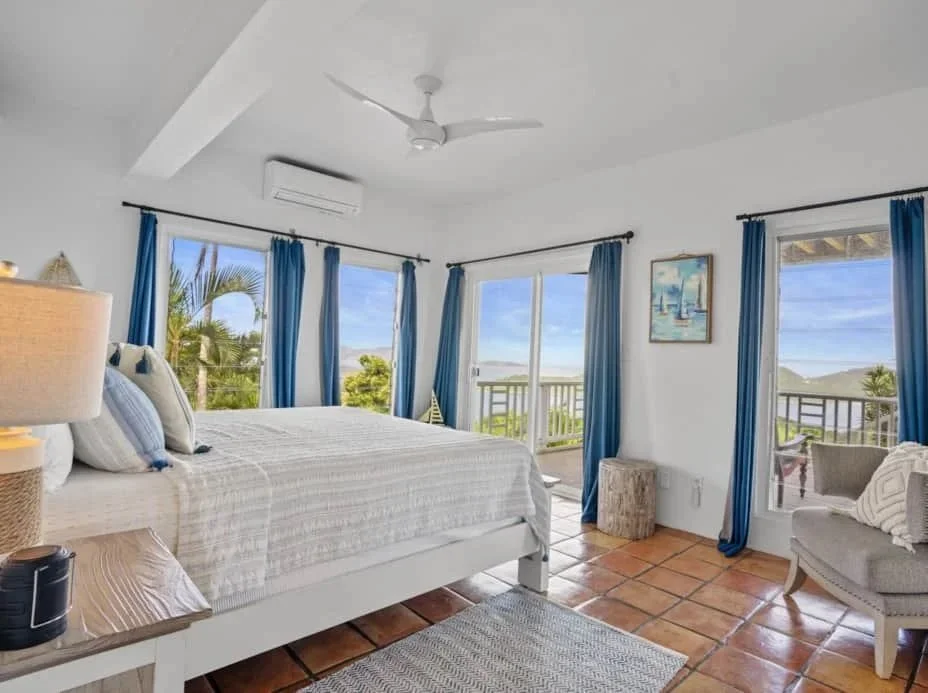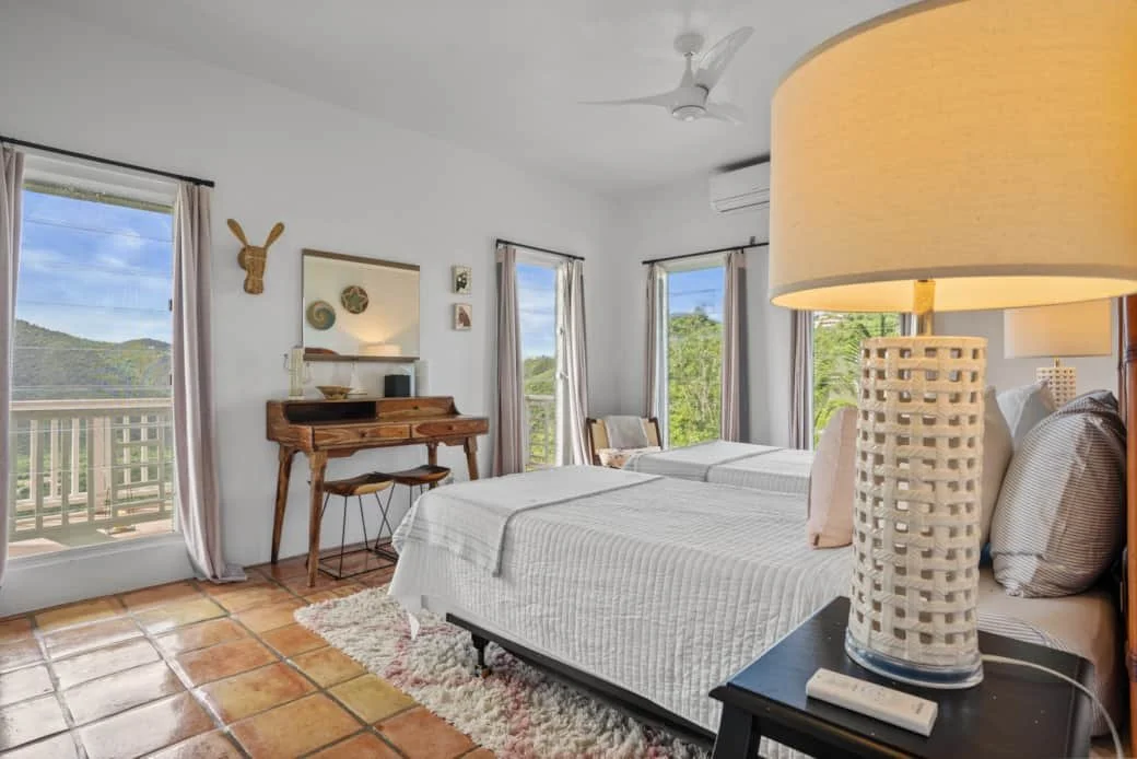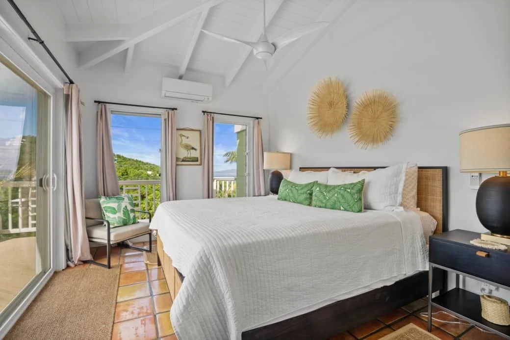 Enjoy one of our king bedrooms with a shared bathroom between them and exclusive access to the outdoor shower. These bedrooms are on the upper level and have stunning views of Coral Bay. Two of these rooms are available.